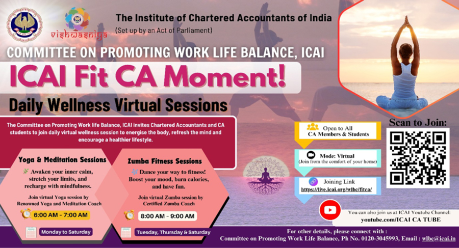 In alignment to support the holistic well-being of Chartered Accountants fraternity, the Committee on Promoting Work-Life Balance proudly brings to you “Fit CA Moment!” a dynamic wellness initiative designed to enable CA Members and Students unleash their best selves, sharpen their focus, and thrive both personally and professionally.